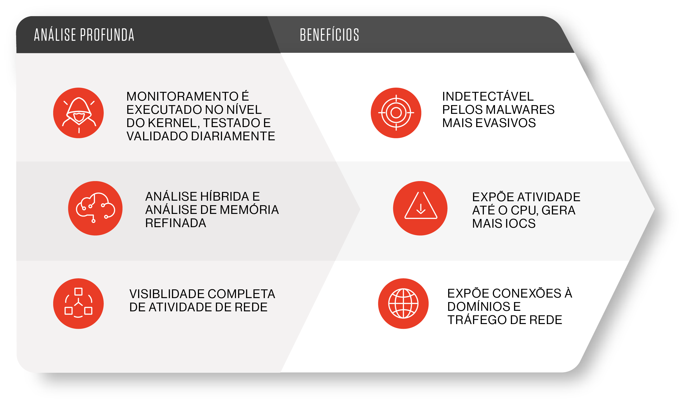 Desvende o ciclo de vida completo do ataque com informações minuciosas sobre todas as atividades de arquivo, rede, memória e processo.